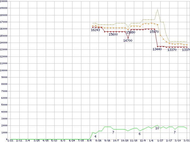 ※このグラフは過去のデータも税率5%相当に調整した税込み相当額のグラフです。 税率変更や、総額表示方式導入(2004年4月)の影響は除いています。 | | | ●凡例 | 最安値 (点線部は販売店未確認 または未調査) | 平均値 | 最高値 | ショップ数 |