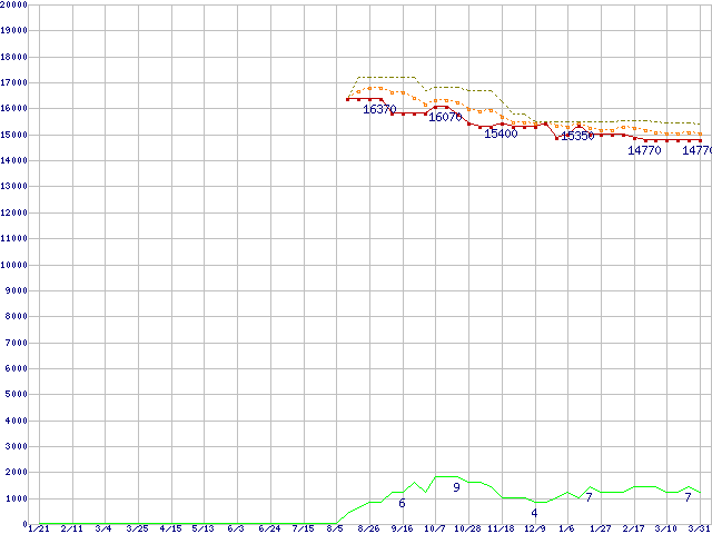 ※このグラフは過去のデータも税率5%相当に調整した税込み相当額のグラフです。 税率変更や、総額表示方式導入(2004年4月)の影響は除いています。 | | | ●凡例 | 最安値 (点線部は販売店未確認 または未調査) | 平均値 | 最高値 | ショップ数 |