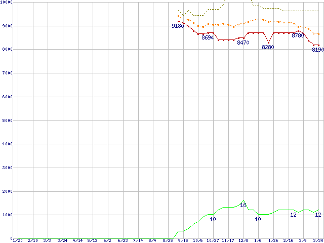 ※このグラフは過去のデータも税率5%相当に調整した税込み相当額のグラフです。 税率変更や、総額表示方式導入(2004年4月)の影響は除いています。 | | | ●凡例 | 最安値 (点線部は販売店未確認 または未調査) | 平均値 | 最高値 | ショップ数 |