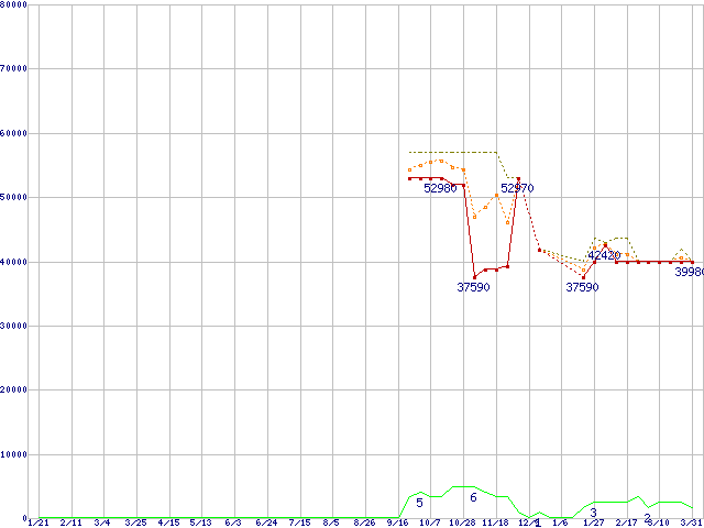 ※このグラフは過去のデータも税率5%相当に調整した税込み相当額のグラフです。 税率変更や、総額表示方式導入(2004年4月)の影響は除いています。 | | | ●凡例 | 最安値 (点線部は販売店未確認 または未調査) | 平均値 | 最高値 | ショップ数 |