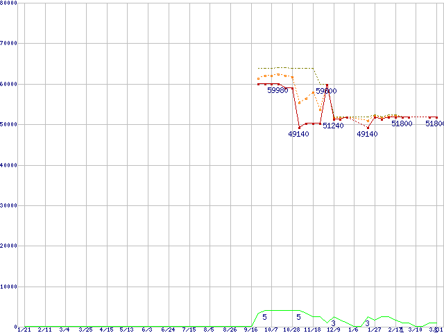 ※このグラフは過去のデータも税率5%相当に調整した税込み相当額のグラフです。 税率変更や、総額表示方式導入(2004年4月)の影響は除いています。 | | | ●凡例 | 最安値 (点線部は販売店未確認 または未調査) | 平均値 | 最高値 | ショップ数 |