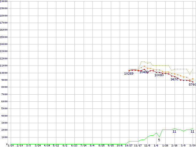 ※このグラフは過去のデータも税率5%相当に調整した税込み相当額のグラフです。 税率変更や、総額表示方式導入(2004年4月)の影響は除いています。 | | | ●凡例 | 最安値 (点線部は販売店未確認 または未調査) | 平均値 | 最高値 | ショップ数 |