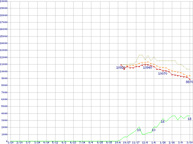 ※このグラフは過去のデータも税率5%相当に調整した税込み相当額のグラフです。 税率変更や、総額表示方式導入(2004年4月)の影響は除いています。 | | | ●凡例 | 最安値 (点線部は販売店未確認 または未調査) | 平均値 | 最高値 | ショップ数 |