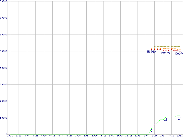 ※このグラフは過去のデータも税率5%相当に調整した税込み相当額のグラフです。 税率変更や、総額表示方式導入(2004年4月)の影響は除いています。 | | | ●凡例 | 最安値 (点線部は販売店未確認 または未調査) | 平均値 | 最高値 | ショップ数 |
