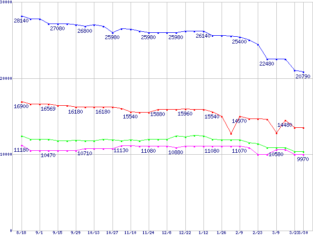 | Barracuda 7200.8 SATA (7200rpm,Serial ATA,NCQ,8MB,133GB/Platter)の最安値推移 | | | (2005年8月18日~2006年3月30日) |