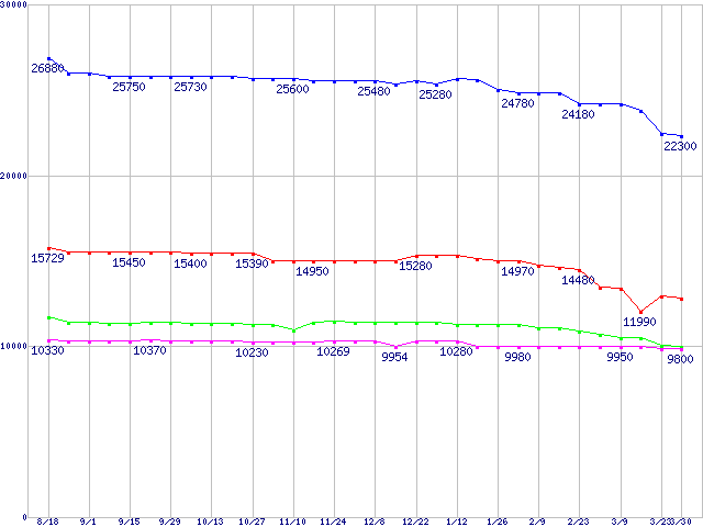 | Barracuda 7200.8 (7200rpm,Ultra ATA/100,8MB,133GB/Platter)の最安値推移 | | | (2005年8月18日~2006年3月30日) |