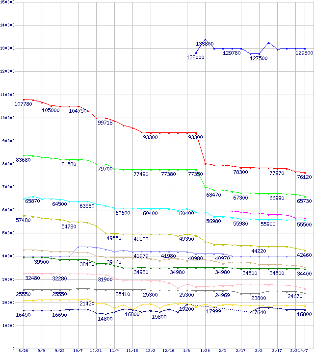 | 凡例 | Athlon 64 FX-60 (2.6GHz,L2 1MBx2) | Athlon 64 X2 4800+ (2.4GHz,L2 1MBx2) | Athlon 64 X2 4600+ (2.4GHz,L2 512KBx2) | Athlon 64 X2 4400+ (2.2GHz,L2 1MBx2,TDP89W) | Athlon 64 X2 4400+ (2.2GHz,L2 1MBx2) | Athlon 64 X2 4200+ (2.2GHz,L2 512KBx2) | Athlon 64 4000+ (2.4GHz,L2 1MB) | Athlon 64 X2 3800+ (2.0GHz,L2 512KBx2) | Athlon 64 3800+ (2.4GHz,L2 512KB) | Athlon 64 3700+ (2.2GHz,L2 1MB) | Athlon 64 3500+ (2.2GHz,L2 512KB) | Athlon 64 3200+ (2GHz,L2 512KB) | Athlon 64 3000+ (1.8GHz,L2 512KB) | ※製品名をクリックすると個別のグラフを表示します ※点線部は販売店が確認できなかった、または調査データがないことを示します |