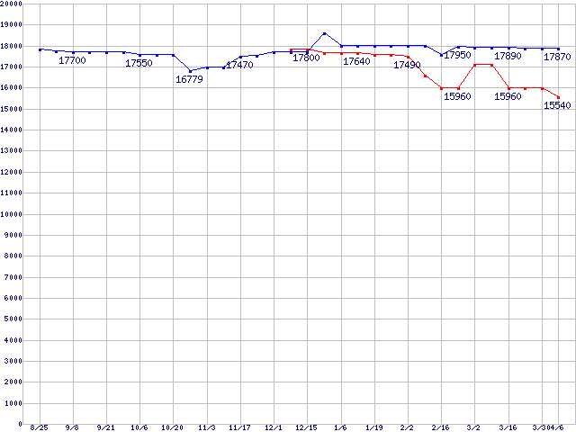 HDD主要製品(最安値1万5千円~2万円未満)の最安値推移