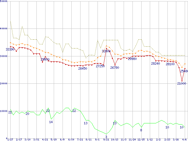 | HDS724040KLSA80 (400GB,8MB)の価格推移 | | | (2005年1月27日~2006年4月6日) |