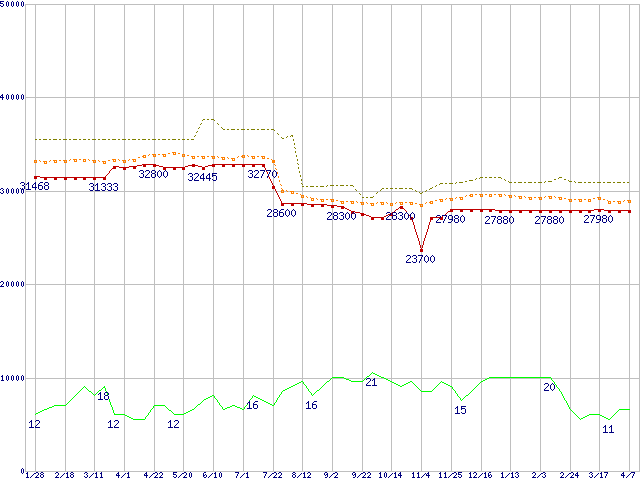 ※このグラフは過去のデータも税率5%相当に調整した税込み相当額のグラフです。 税率変更や、総額表示方式導入(2004年4月)の影響は除いています。 | | | ●凡例 | 最安値 (点線部は販売店未確認 または未調査) | 平均値 | 最高値 | ショップ数 |