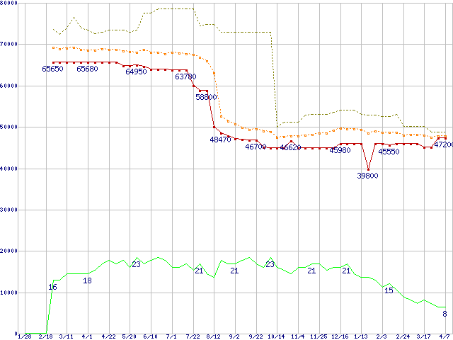 ※このグラフは過去のデータも税率5%相当に調整した税込み相当額のグラフです。 税率変更や、総額表示方式導入(2004年4月)の影響は除いています。 | | | ●凡例 | 最安値 (点線部は販売店未確認 または未調査) | 平均値 | 最高値 | ショップ数 |