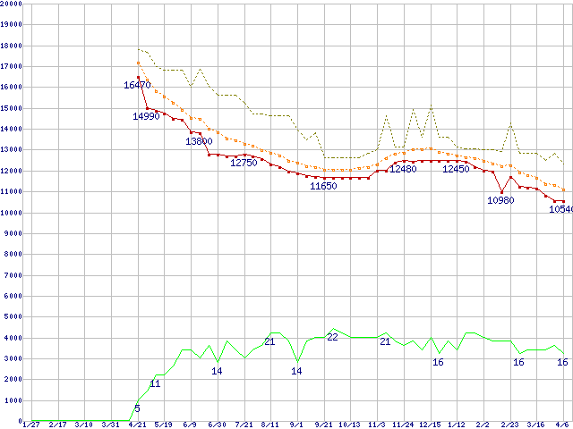 ※このグラフは過去のデータも税率5%相当に調整した税込み相当額のグラフです。 税率変更や、総額表示方式導入(2004年4月)の影響は除いています。 | | | ●凡例 | 最安値 (点線部は販売店未確認 または未調査) | 平均値 | 最高値 | ショップ数 |