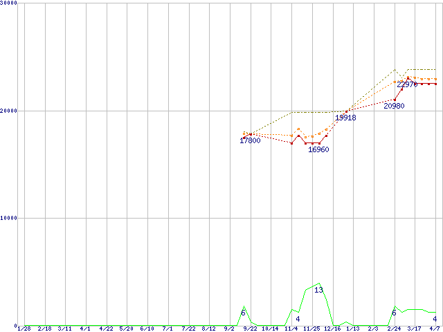 ※このグラフは過去のデータも税率5%相当に調整した税込み相当額のグラフです。 税率変更や、総額表示方式導入(2004年4月)の影響は除いています。 | | | ●凡例 | 最安値 (点線部は販売店未確認 または未調査) | 平均値 | 最高値 | ショップ数 |