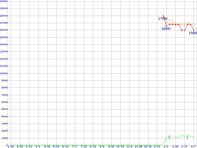 ※このグラフは過去のデータも税率5%相当に調整した税込み相当額のグラフです。 税率変更や、総額表示方式導入(2004年4月)の影響は除いています。 | | | ●凡例 | 最安値 (点線部は販売店未確認 または未調査) | 平均値 | 最高値 | ショップ数 |