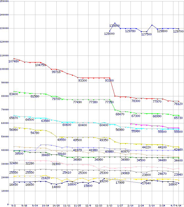 | 凡例 | Athlon 64 FX-60 (2.6GHz,L2 1MBx2) | Athlon 64 X2 4800+ (2.4GHz,L2 1MBx2) | Athlon 64 X2 4600+ (2.4GHz,L2 512KBx2) | Athlon 64 X2 4400+ (2.2GHz,L2 1MBx2,TDP89W) | Athlon 64 X2 4400+ (2.2GHz,L2 1MBx2) | Athlon 64 X2 4200+ (2.2GHz,L2 512KBx2) | Athlon 64 4000+ (2.4GHz,L2 1MB) | Athlon 64 X2 3800+ (2.0GHz,L2 512KBx2) | Athlon 64 3800+ (2.4GHz,L2 512KB) | Athlon 64 3700+ (2.2GHz,L2 1MB) | Athlon 64 3500+ (2.2GHz,L2 512KB) | Athlon 64 3200+ (2GHz,L2 512KB) | Athlon 64 3000+ (1.8GHz,L2 512KB) | ※製品名をクリックすると個別のグラフを表示します ※点線部は販売店が確認できなかった、または調査データがないことを示します |