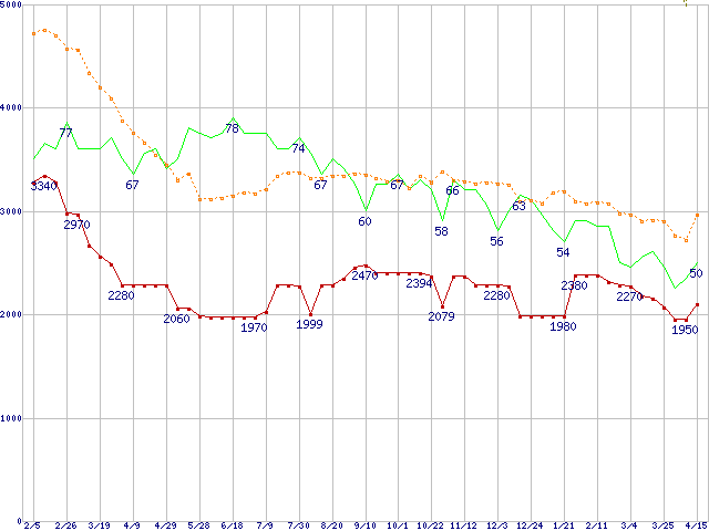 ※このグラフは過去のデータも税率5%相当に調整した税込み相当額のグラフです。 税率変更や、総額表示方式導入(2004年4月)の影響は除いています。 | | | ●凡例 | 最安値 (点線部は販売店未確認 または未調査) | 平均値 | 最高値 | ショップ数 |