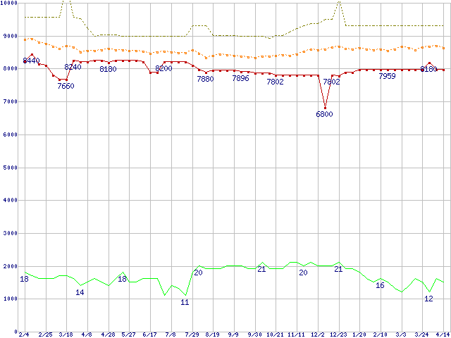 ※このグラフは過去のデータも税率5%相当に調整した税込み相当額のグラフです。 税率変更や、総額表示方式導入(2004年4月)の影響は除いています。 | | | ●凡例 | 最安値 (点線部は販売店未確認 または未調査) | 平均値 | 最高値 | ショップ数 |