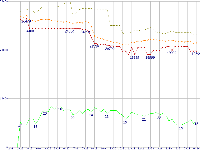 ※このグラフは過去のデータも税率5%相当に調整した税込み相当額のグラフです。 税率変更や、総額表示方式導入(2004年4月)の影響は除いています。 | | | ●凡例 | 最安値 (点線部は販売店未確認 または未調査) | 平均値 | 最高値 | ショップ数 |