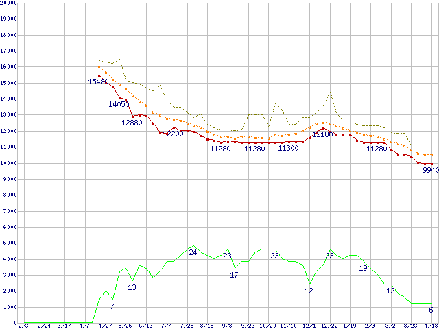 ※このグラフは過去のデータも税率5%相当に調整した税込み相当額のグラフです。 税率変更や、総額表示方式導入(2004年4月)の影響は除いています。 | | | ●凡例 | 最安値 (点線部は販売店未確認 または未調査) | 平均値 | 最高値 | ショップ数 |