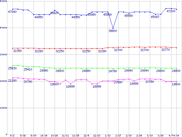 | LGA 775 (FSB 800MHz,L2 2MB,Hyper-Threading,EM64T対応)の最安値推移 | | | (2005年9月2日~2006年4月14日) |
