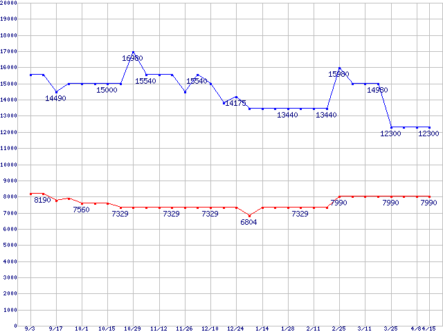 | PC3200(DDR400) DDR SDRAM DIMM ECC対応 Registeredタイプの最安値推移 | | | (2005年9月3日~2006年4月15日) |