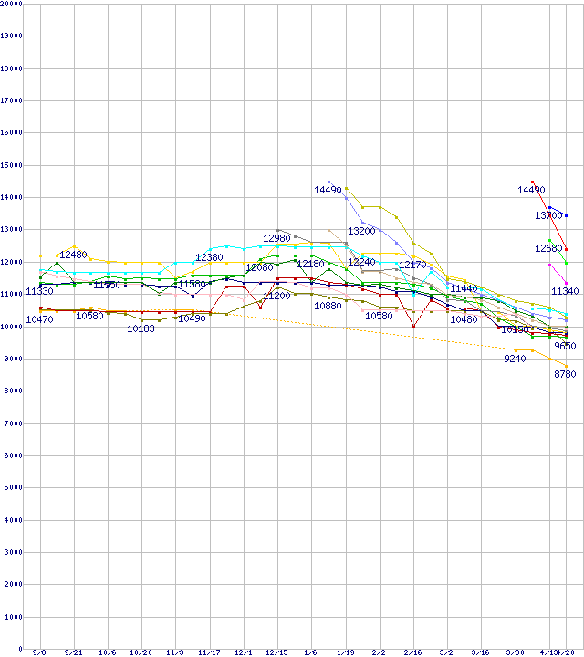 | HDD 250~300GB未満の最安値推移 | | | (2005年9月8日~2006年4月20日) |