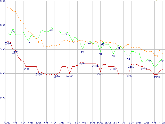 ※このグラフは過去のデータも税率5%相当に調整した税込み相当額のグラフです。 税率変更や、総額表示方式導入(2004年4月)の影響は除いています。 | | | ●凡例 | 最安値 (点線部は販売店未確認 または未調査) | 平均値 | 最高値 | ショップ数 |