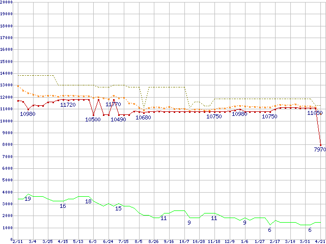 ※このグラフは過去のデータも税率5%相当に調整した税込み相当額のグラフです。 税率変更や、総額表示方式導入(2004年4月)の影響は除いています。 | | | ●凡例 | 最安値 (点線部は販売店未確認 または未調査) | 平均値 | 最高値 | ショップ数 |