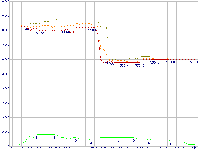 | Xeon 3.40GHz (L2 2MB)の価格推移 | | | (2005年2月11日~2006年4月21日) |