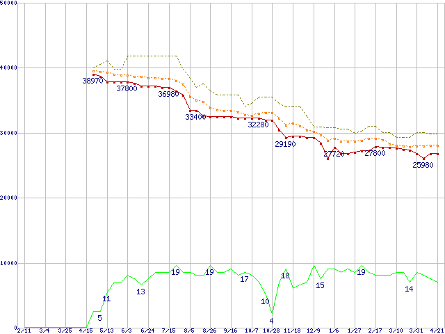 | Athlon 64 3700+ (2.2GHz,L2 1MB)の価格推移 | | | (2005年2月11日~2006年4月21日) |