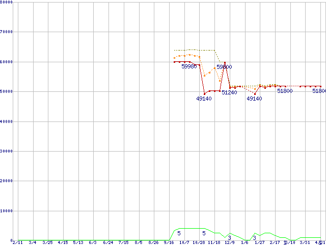 ※このグラフは過去のデータも税率5%相当に調整した税込み相当額のグラフです。 税率変更や、総額表示方式導入(2004年4月)の影響は除いています。 | | | ●凡例 | 最安値 (点線部は販売店未確認 または未調査) | 平均値 | 最高値 | ショップ数 |