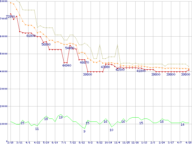 | Athlon 64 4000+ (2.4GHz,L2 1MB)の価格推移 | | | (2005年2月18日~2006年4月28日) |