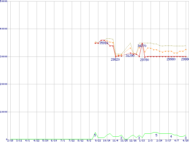 ※このグラフは過去のデータも税率5%相当に調整した税込み相当額のグラフです。 税率変更や、総額表示方式導入(2004年4月)の影響は除いています。 | | | ●凡例 | 最安値 (点線部は販売店未確認 または未調査) | 平均値 | 最高値 | ショップ数 |