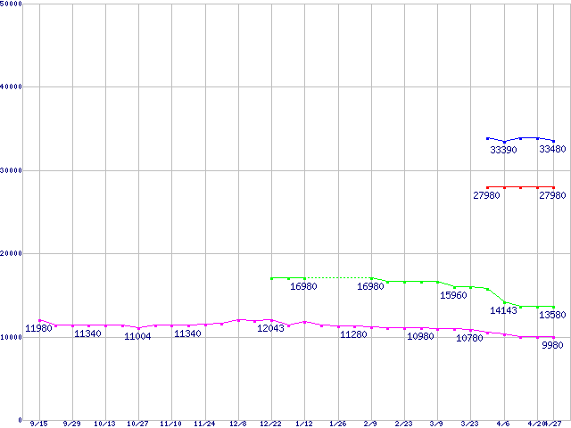 | WD Caviar SE16 (7200rpm,Serial ATA II/3Gbps,16MB)の最安値推移 | | | (2005年9月15日~2006年4月27日) |