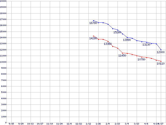 | MaXLine III (7200rpm,16MB,Serial ATA II,3Gbps)の最安値推移 | | | (2005年9月15日~2006年4月27日) |