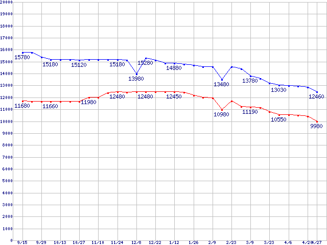 | MaXLine III (7200rpm,16MB,Ultra ATA/133,RoHS指令準拠)の最安値推移 | | | (2005年9月15日~2006年4月27日) |