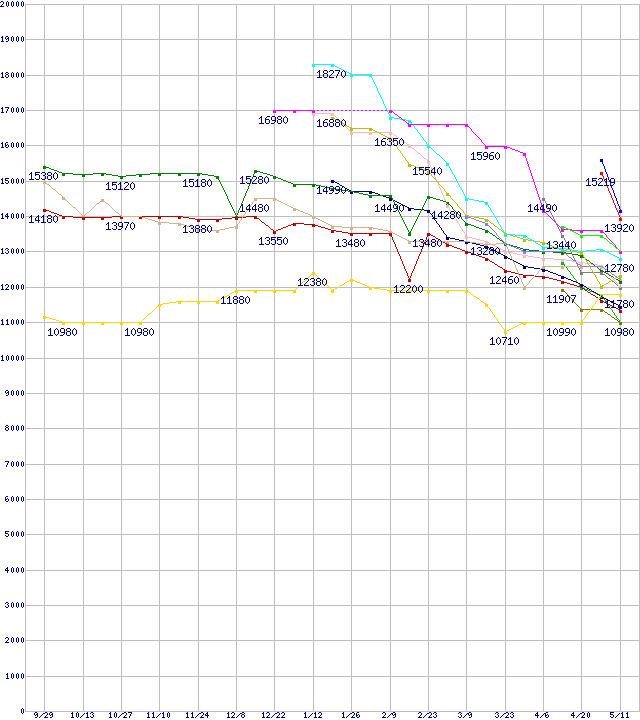 | HDD主要製品(最安値1万円~1万5千円未満)の最安値推移 | | | (2005年9月29日~2006年5月11日) |