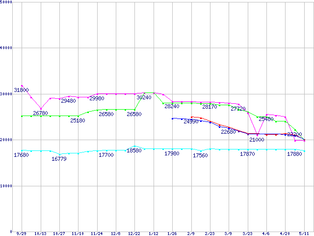 HDD主要製品(最安値1万5千円~2万円未満)の最安値推移
