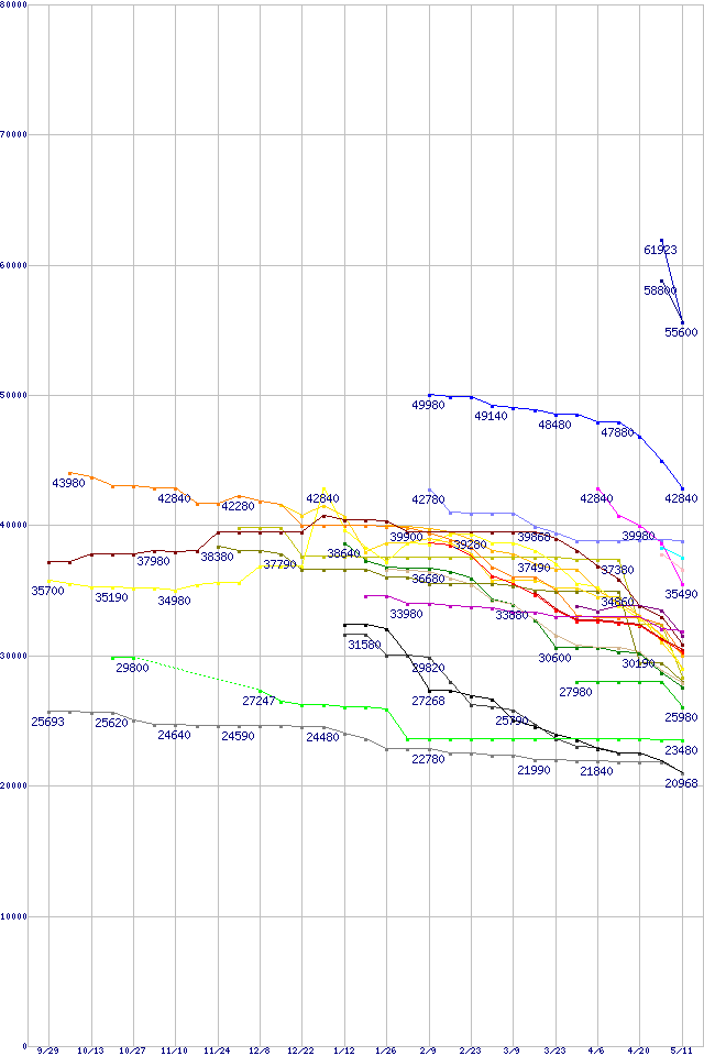 | HDD主要製品(最安値2万円以上)の最安値推移 | | | (2005年9月29日~2006年5月11日) |