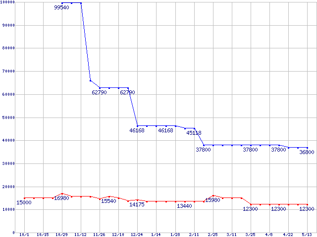 メモリ主要製品(最安値1万円以上)の最安値推移