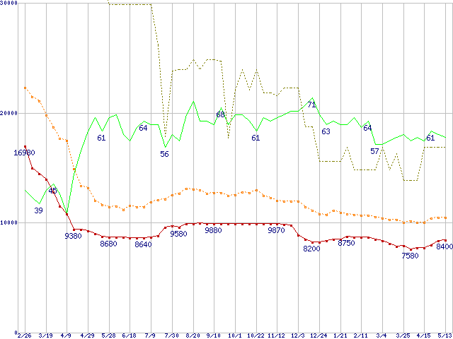 ※このグラフは過去のデータも税率5%相当に調整した税込み相当額のグラフです。 税率変更や、総額表示方式導入(2004年4月)の影響は除いています。 | | | ●凡例 | 最安値 (点線部は販売店未確認 または未調査) | 平均値 | 最高値 | ショップ数 |