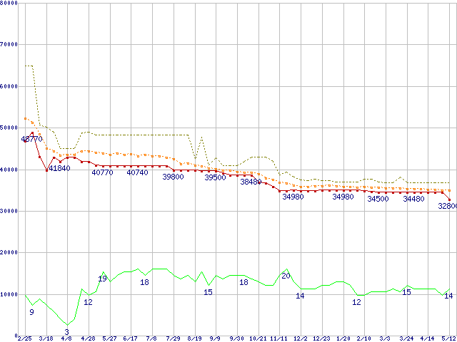 | Athlon 64 3800+ (2.4GHz,L2 512KB)の価格推移 | | | (2005年2月25日~2006年5月12日) |