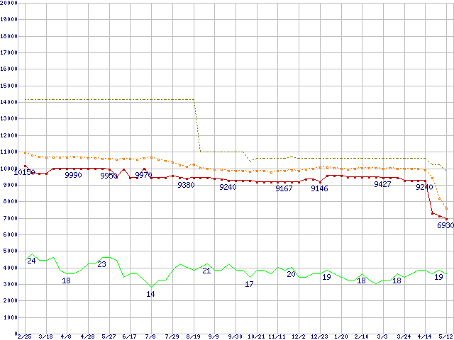 ※このグラフは過去のデータも税率5%相当に調整した税込み相当額のグラフです。 税率変更や、総額表示方式導入(2004年4月)の影響は除いています。 | | | ●凡例 | 最安値 (点線部は販売店未確認 または未調査) | 平均値 | 最高値 | ショップ数 |
