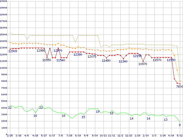 ※このグラフは過去のデータも税率5%相当に調整した税込み相当額のグラフです。 税率変更や、総額表示方式導入(2004年4月)の影響は除いています。 | | | ●凡例 | 最安値 (点線部は販売店未確認 または未調査) | 平均値 | 最高値 | ショップ数 |