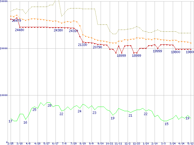 ※このグラフは過去のデータも税率5%相当に調整した税込み相当額のグラフです。 税率変更や、総額表示方式導入(2004年4月)の影響は除いています。 | | | ●凡例 | 最安値 (点線部は販売店未確認 または未調査) | 平均値 | 最高値 | ショップ数 |