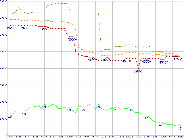 ※このグラフは過去のデータも税率5%相当に調整した税込み相当額のグラフです。 税率変更や、総額表示方式導入(2004年4月)の影響は除いています。 | | | ●凡例 | 最安値 (点線部は販売店未確認 または未調査) | 平均値 | 最高値 | ショップ数 |