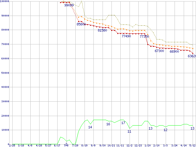 ※このグラフは過去のデータも税率5%相当に調整した税込み相当額のグラフです。 税率変更や、総額表示方式導入(2004年4月)の影響は除いています。 | | | ●凡例 | 最安値 (点線部は販売店未確認 または未調査) | 平均値 | 最高値 | ショップ数 |