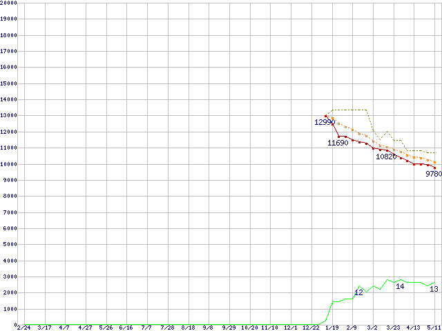 ※このグラフは過去のデータも税率5%相当に調整した税込み相当額のグラフです。 税率変更や、総額表示方式導入(2004年4月)の影響は除いています。 | | | ●凡例 | 最安値 (点線部は販売店未確認 または未調査) | 平均値 | 最高値 | ショップ数 |