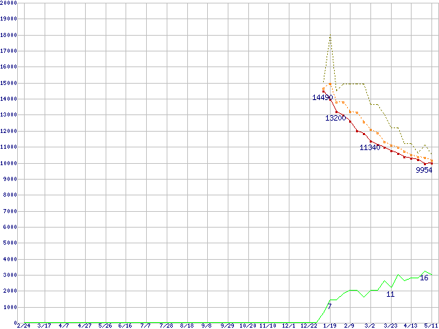 ※このグラフは過去のデータも税率5%相当に調整した税込み相当額のグラフです。 税率変更や、総額表示方式導入(2004年4月)の影響は除いています。 | | | ●凡例 | 最安値 (点線部は販売店未確認 または未調査) | 平均値 | 最高値 | ショップ数 |