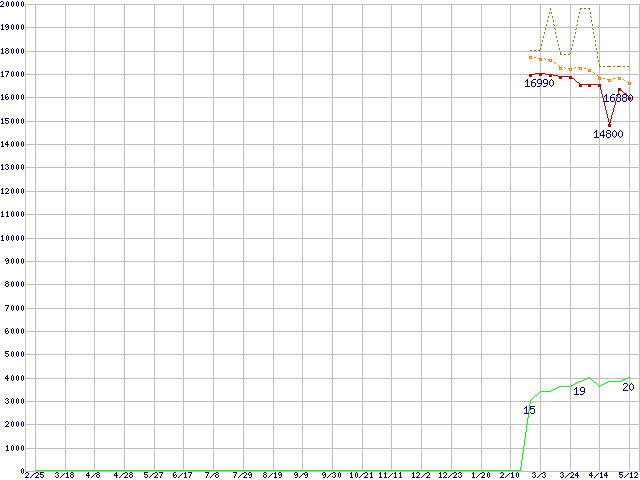 ※このグラフは過去のデータも税率5%相当に調整した税込み相当額のグラフです。 税率変更や、総額表示方式導入(2004年4月)の影響は除いています。 | | | ●凡例 | 最安値 (点線部は販売店未確認 または未調査) | 平均値 | 最高値 | ショップ数 |